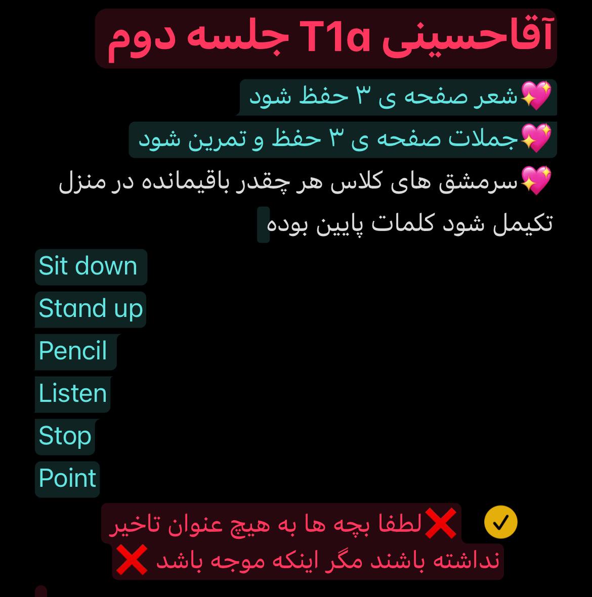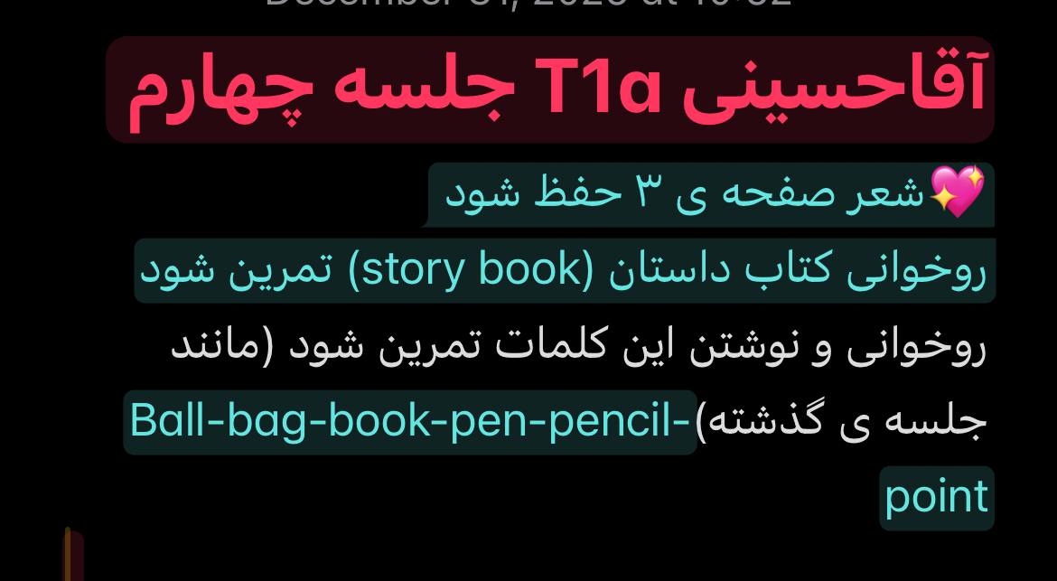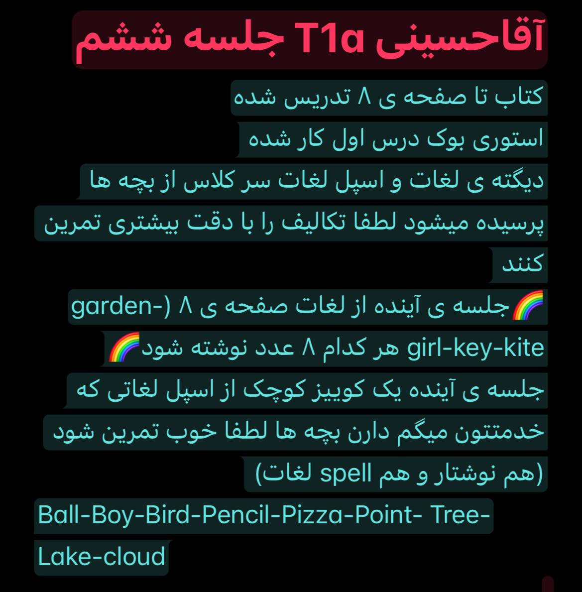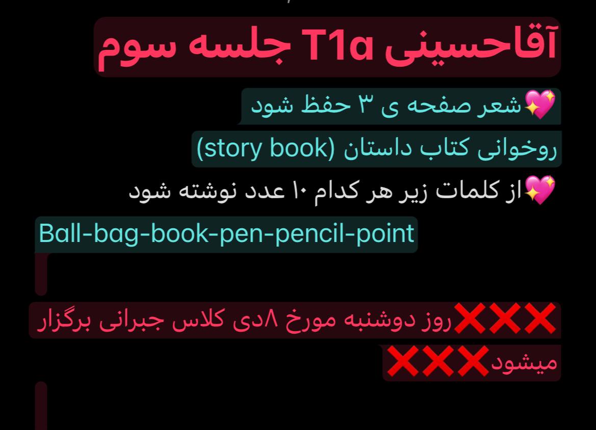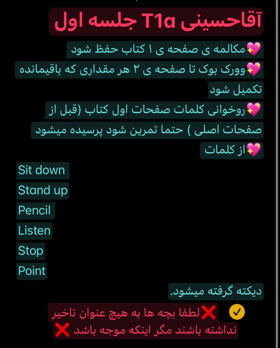 توضیحات : زبان آموزان گرامی لطفا ثبت نام ترم جدید را تکمیل نمایید. جلسه بعد فاینال برگزار می شود.